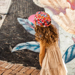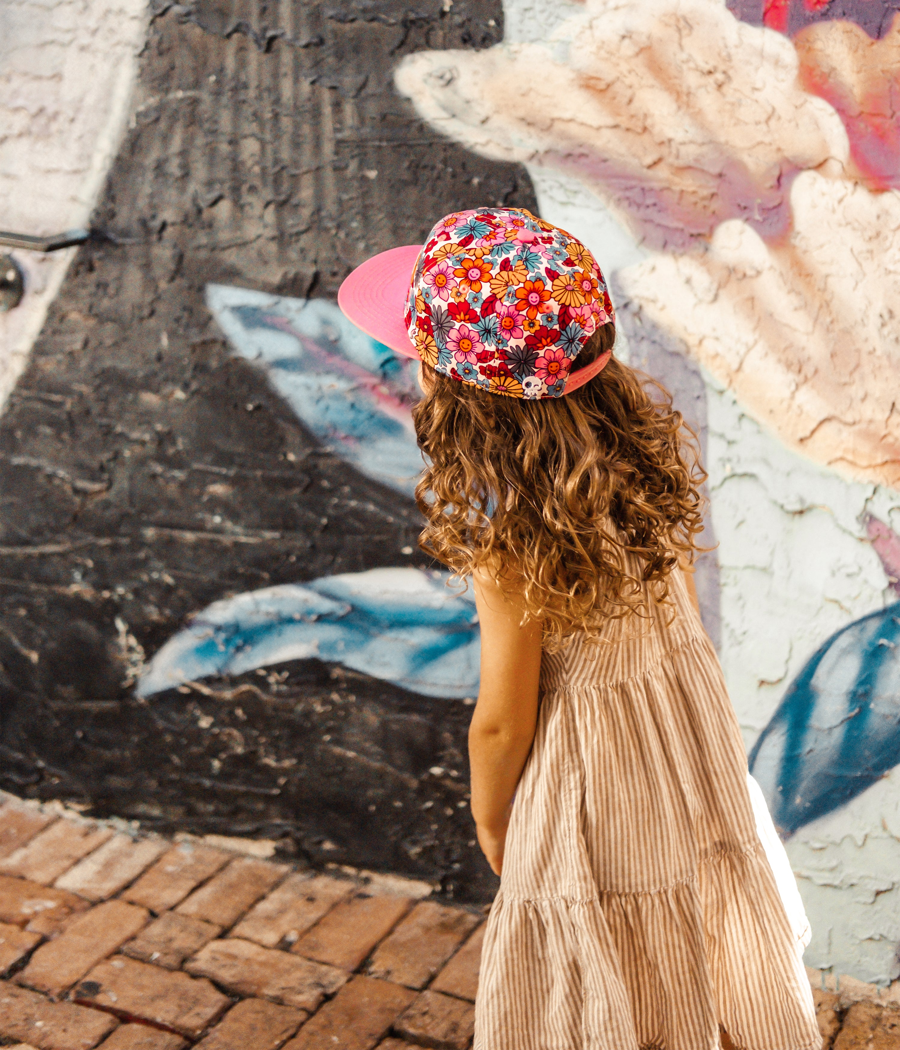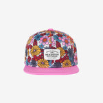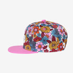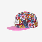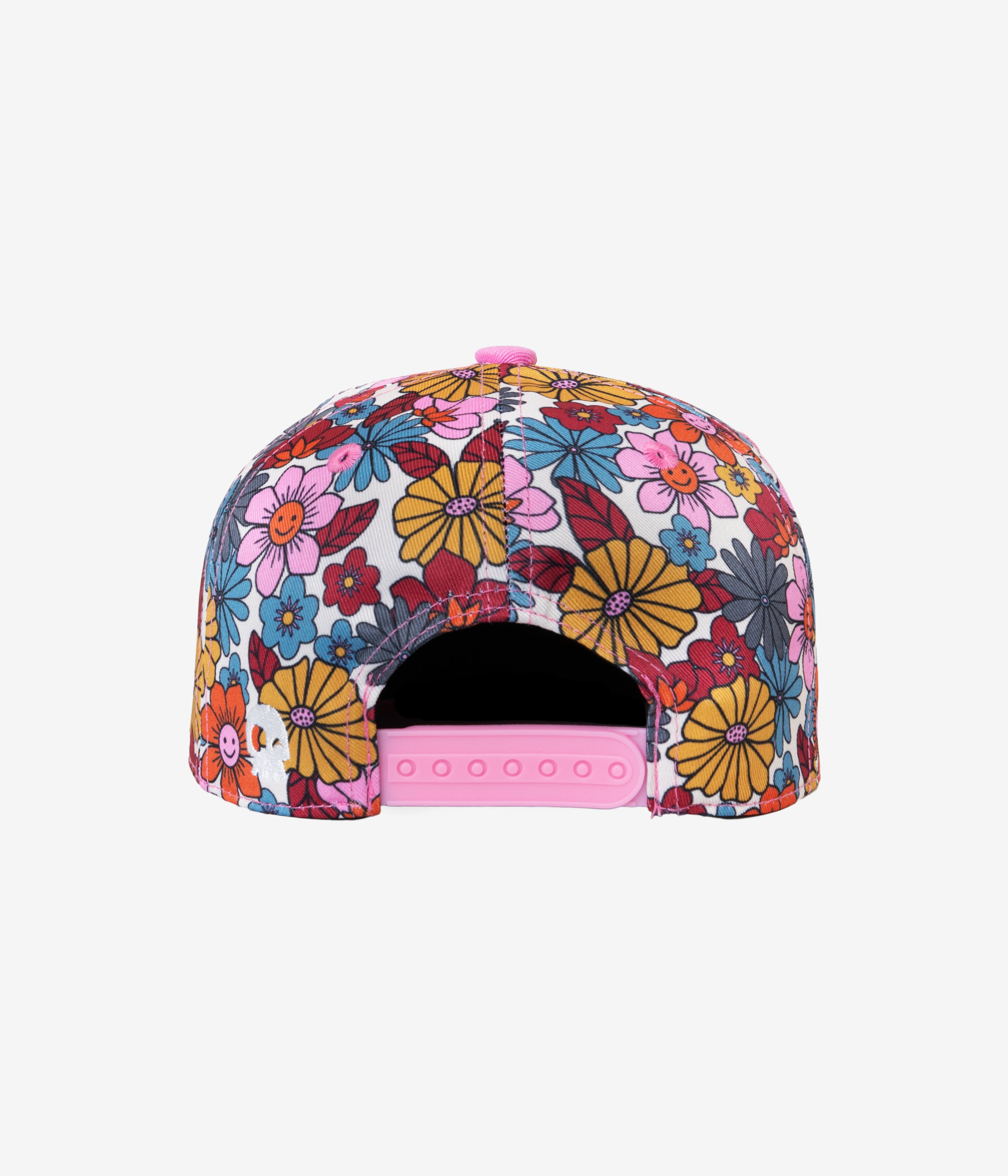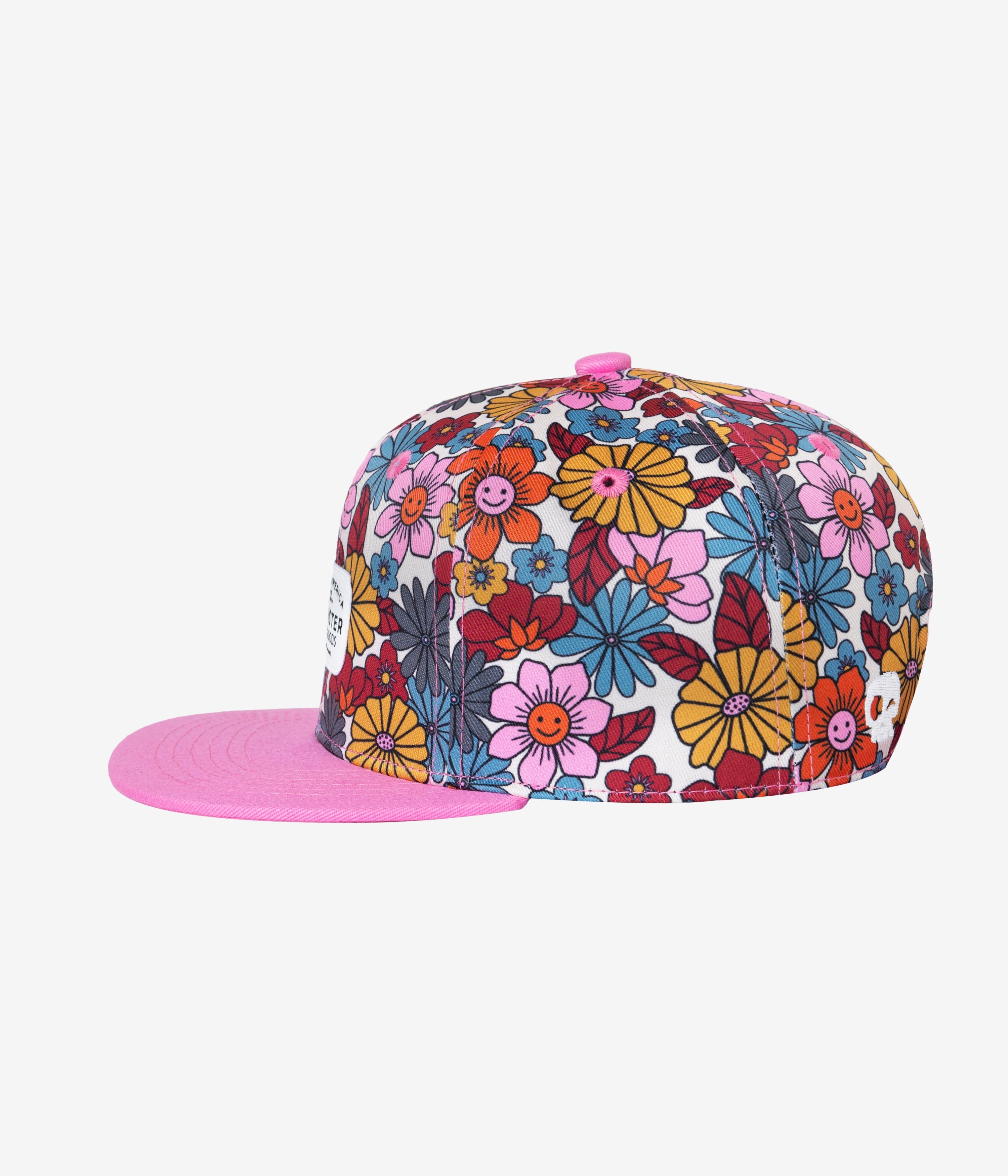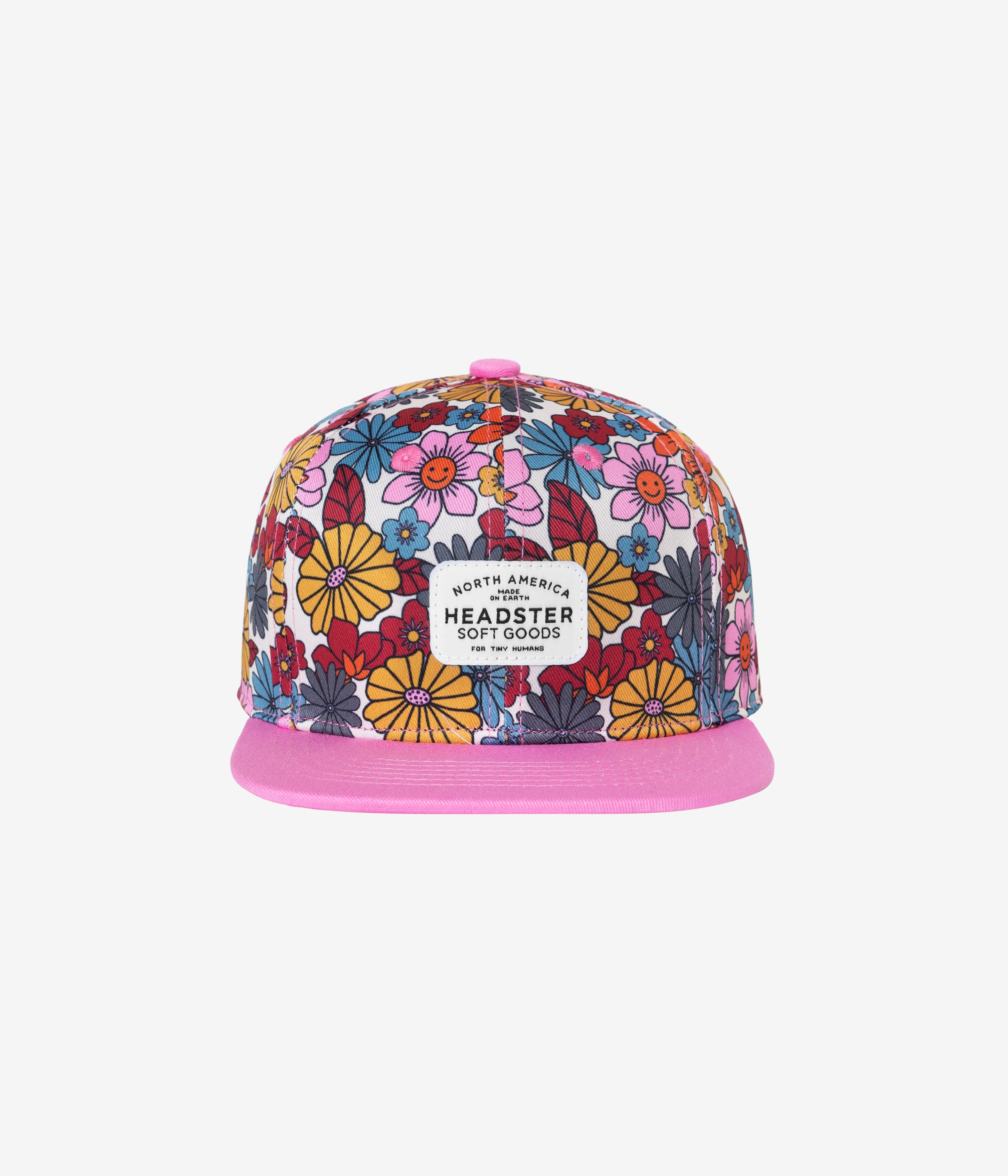This hat features a vintage inspired floral and smiley faces, everything we love at Headster Kids.